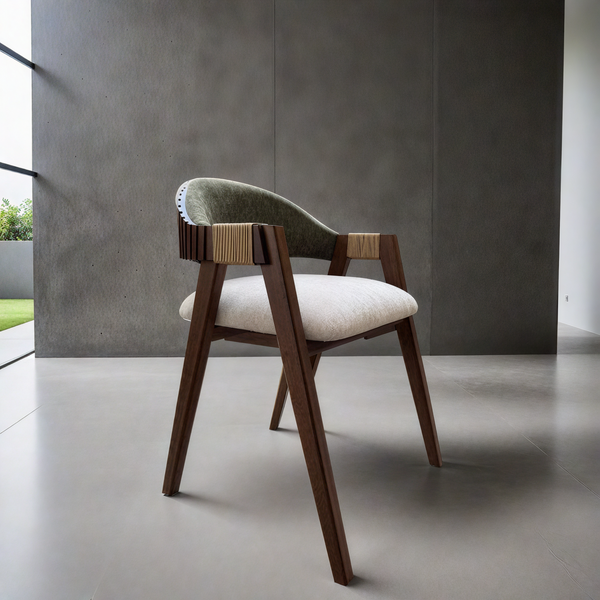 Silla fabricada en madera sólida de rosa morada entintada con acabado en laca de poliuretano y tapizado en tela 100% lavable.